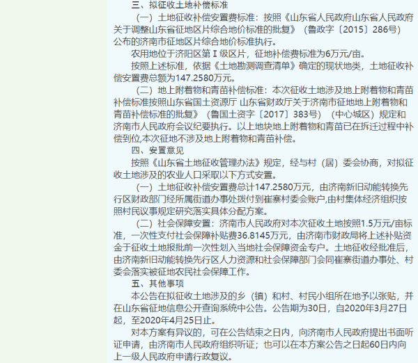 济南新旧动能转换先行区近日,济南市人民政府发布征地启动公告,为保障济南新旧动能转换先行区建设用地需要,拟对先行区大桥、崔寨街道的14个村征收土地。 从一系列公告内容看,拟征收土地用途为商服用地、工矿仓储用地和交通运输用地。14个村包括崔寨街道的崔寨村、牛家村、前街村,大桥街道的赵家村、尹店村、小王村、小店村、西车村、魏梁村、南车村、焦集村、东车村、大王村、大刘村。公告称,本次拟征收土地用于先行区项目建设。该项目为在土地利用总体规划确定的城镇建设用地范围内,经省级以上人民政府批准,由县级以上地方人民政府组织实施的成片开发建设,符合法律规定的可以征收情形。征地启动公告发布后,拟于2020年3月30日至2020年4月29日由先行区组织有关部门进行勘测定界和清点确认。凡在拟征收土地范围内抢栽、抢种、抢建的,一律不予补偿。补偿安置方案根据公示的崔寨村拟征收土地补偿安置公告,征收土地总面积14.097亩。农用地位于济阳区第Ⅰ级区片,征地补偿费标准为6万元/亩,土地征收补偿安置费总额为84.582万元。对本次征收土地按照1.5万元/亩标准,一次性支付社会保障补贴费21.1455万元。