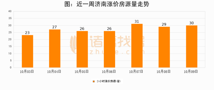 根据诸葛找房数据显示,济南24小时涨价房源量为30套,较10月08日增加1套,环比上涨3.4%。与此同时,涨价房源占比小幅扩大,业主信心有所提升。