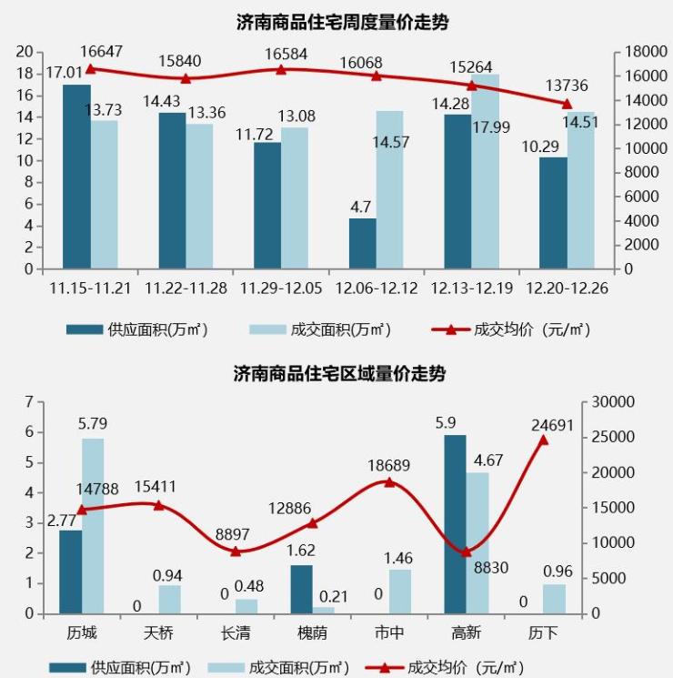 12月20日—12月26日,济南商品住宅市场新增供应10.29万㎡;成交面积14.51万㎡,环比下降19.34%,成交均价13736元/㎡,环比下降10.01%;主力成交项目为空港花园、雪山万科城等;本周历城区为主力成交区域。