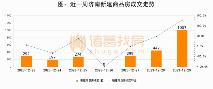 根据济南市住房和城乡建设局数据显示,2023年12月29日济南新建商品房成交1007套,较昨日增加565套,环比上涨127.8%
