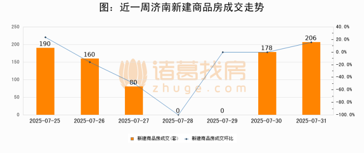 根据济南市住房和城乡建设局数据显示,2025年07月31日济南新建商品房成交206套,较昨日增加28套,环比上涨15.7%