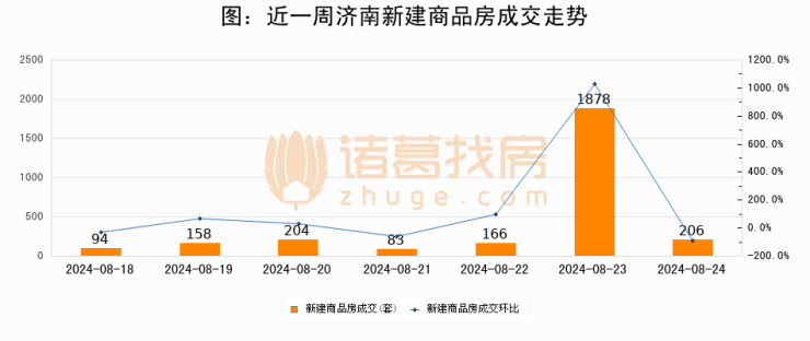 根据济南市住房和城乡建设局数据显示,2024年08月24日济南新建商品房成交206套,较昨日减少1672套,环比下降89%