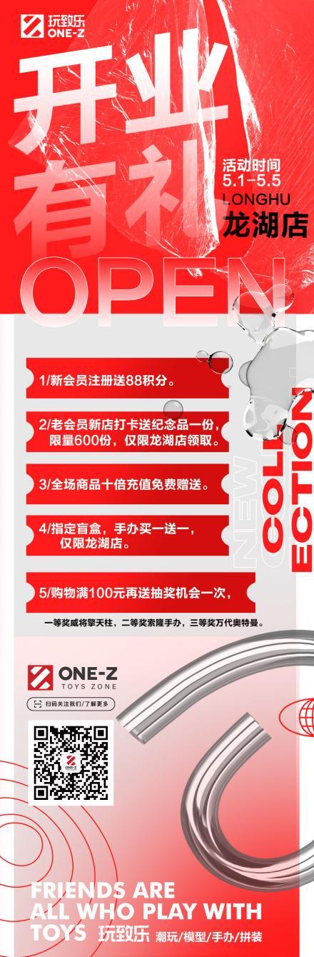 潮玩偶像由你定义,随时随地激发灵感创意。玩致乐新店开业有礼:新会员注册送88积分,老会员新店打卡送纪念品一份,限量600份,仅限龙湖店领取。全场商品10倍充值免费赠送,指定盲盒、手办买一送一,仅限龙湖店。购物满100元再送抽奖机会一次,一等奖威将擎天柱,二等奖索隆手办,三等奖万代奥特曼。