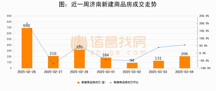 根据济南市住房和城乡建设局数据显示,2025年03月04日济南新建商品房成交206套,较昨日增加75套,环比上涨57.2%