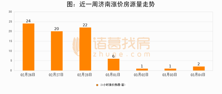 根据诸葛找房数据显示,济南24小时涨价房源量为2套,较03月03日增加1套,环比上涨100%。与此同时,涨价房源占比小幅扩大,业主信心有所提升。