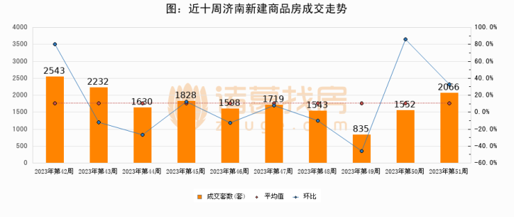进入2023年第51周(12月11日-12月17日),济南新建商品房成交2066套,较上周增加514套,环比上涨33.1%