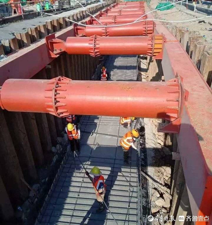 据悉,黄河大道一期工程北起孙耿北路,南至国道104(鹊华东路),全长约16.2公里,其中,项目五标段(邢家渡干渠-104国道)全长约6.1公里,主线设置双向8车道。该标段为济南市多条重要通信光缆的交汇处,在原有道路下面,不仅横穿管线密布,更有两条跨省输气管道和一条输油管道存在。施工过程中,项目克服雨季施工及地下水位高的制约因素,采取钢板桩支护方式,施工高峰期调配87台挖掘机和近150辆渣土车穿梭作业,利用3个月时间完成平均深度8.9米(基坑最深12.8米),60万方的土方开挖及下翻管线施工。