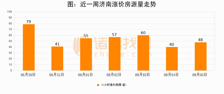 根据诸葛找房数据显示,济南24小时涨价房源量为48套,较09月04日增加8套,环比上涨20%。与此同时,涨价房源占比小幅扩大,业主信心有所提升。