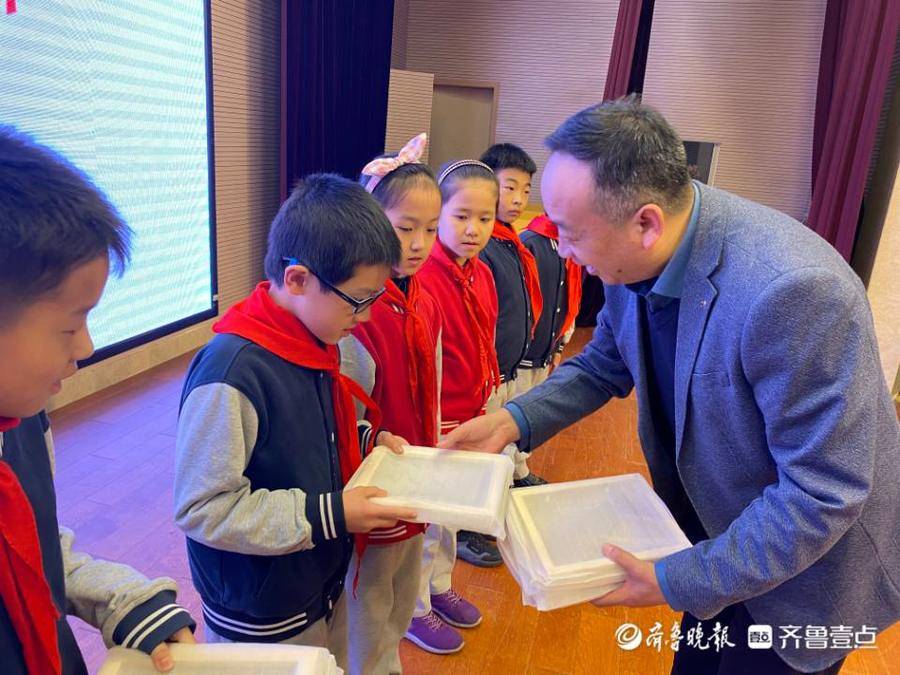 (图片说明:济南名城保护“进校园”活动上,济南市住房和城乡建设局为学生们送上文创礼品)