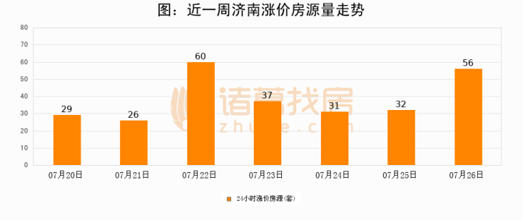根据诸葛找房数据显示,济南24小时涨价房源量为56套,较07月25日增加24套,环比上涨75%。与此同时,涨价房源占比小幅扩大,业主信心有所提升。