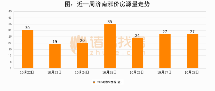 根据诸葛找房数据显示,济南24小时涨价房源量为27套,较10月27日持平。