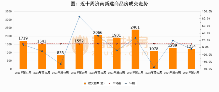 进入2024年第03周(01月15日-01月21日),济南新建商品房成交1234套,较上周减少55套,环比下降4.3%