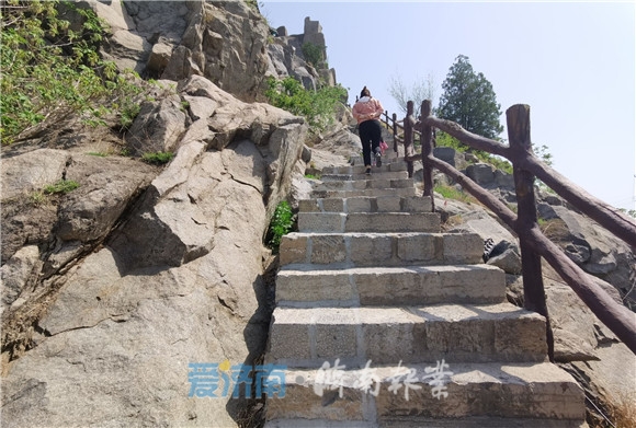 4月11日,在济南齐烟九点之一的鹊山,市民正沿着新修建的避险步道登高望远。