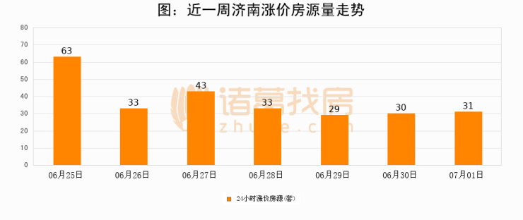根据诸葛找房数据显示,济南24小时涨价房源量为31套,较06月30日增加1套,环比上涨3.3%。与此同时,涨价房源占比小幅扩大,业主信心有所提升。