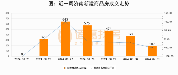 根据济南市住房和城乡建设局数据显示,2024年07月01日济南新建商品房成交187套,较昨日减少185套,环比下降49.7%