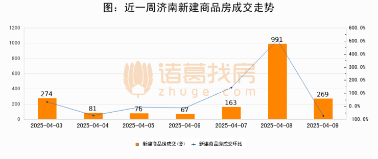 根据济南市住房和城乡建设局数据显示,2025年04月09日济南新建商品房成交269套,较昨日减少722套,环比下降72.9%