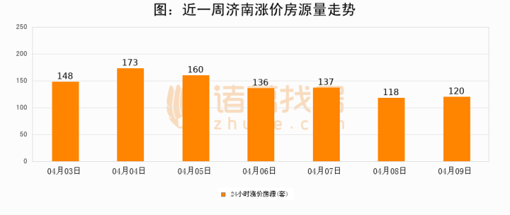 根据诸葛找房数据显示,济南24小时涨价房源量为120套,较04月08日增加2套,环比上涨1.7%。与此同时,涨价房源占比小幅扩大,业主信心有所提升。