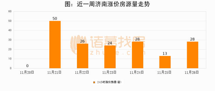 根据诸葛找房数据显示,济南24小时涨价房源量为28套,较11月25日增加15套,环比上涨115.4%。与此同时,涨价房源占比小幅扩大,业主信心有所提升。
