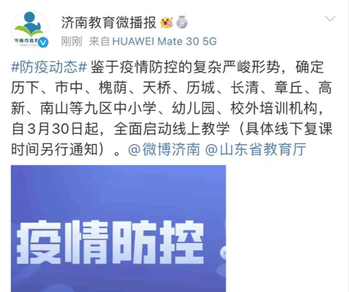 鉴于疫情防控的复杂严峻形势,确定历下、市中、槐荫、天桥、历城、长清、章丘、高新、南山等九区中小学、幼儿园、校外培训机构,自3月30日起,全面启动线上教学(具体线下复课时间另行通知)。