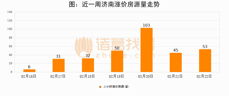 根据诸葛找房数据显示,济南24小时涨价房源量为53套,较02月21日增加8套,环比上涨17.8%。与此同时,涨价房源占比小幅扩大,业主信心有所提升。