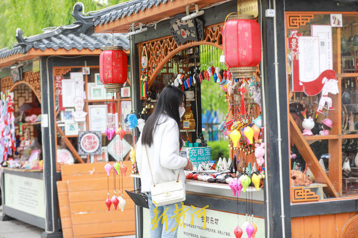 5月10日,在济南老街巷曲水亭街,柳亭、琴亭、棋亭、书亭等12个商亭恢复营业,不少市民和游客前来游玩、选购喜爱的手工艺品。