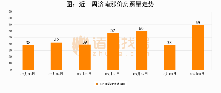 根据诸葛找房数据显示,济南24小时涨价房源量为69套,较03月08日增加31套,环比上涨81.6%。与此同时,涨价房源占比小幅扩大,业主信心有所提升。