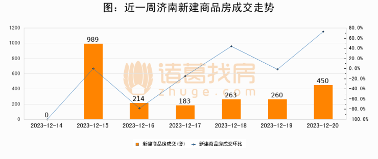 根据济南市住房和城乡建设局数据显示,2023年12月20日济南新建商品房成交450套,较昨日增加190套,环比上涨73.1%