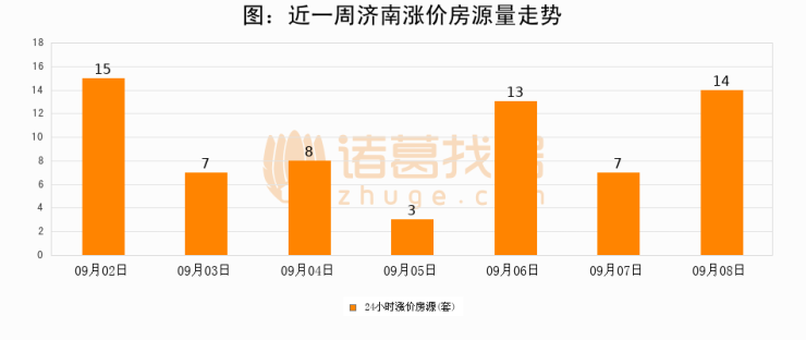 根据诸葛找房数据显示,济南24小时涨价房源量为14套,较09月07日增加7套,环比上涨100%。与此同时,涨价房源占比小幅扩大,业主信心有所提升。