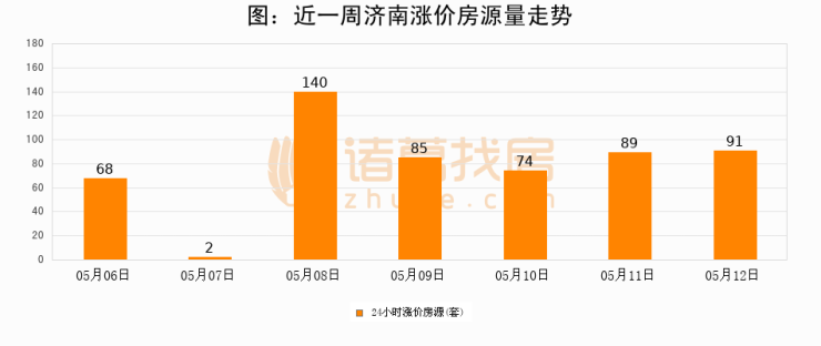 根据诸葛找房数据显示,济南24小时涨价房源量为91套,较05月11日增加2套,环比上涨2.2%。与此同时,涨价房源占比小幅扩大,业主信心有所提升。