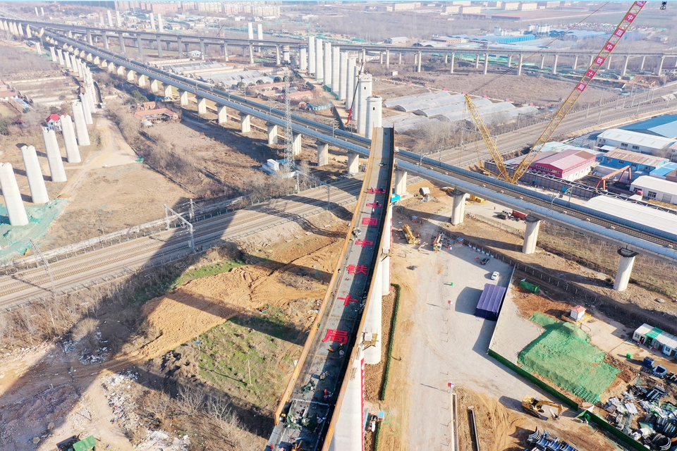 由中铁十局承建的郑济高铁跨京沪高铁特大桥位于济南市市中区,全长约6.68公里。其中,上跨京沪高铁钢箱梁全长186.4米,重1696.8吨,上跨京沪高铁、京沪铁路、水白铁路等3条铁路主干线,由高位拼装焊接完成后采取步履式顶推施工工艺跨越京沪高铁,顶推全程306.9米,施工难点多、风险大,为郑济高铁全线安全风险较高、黄河以南较大控制性工程。