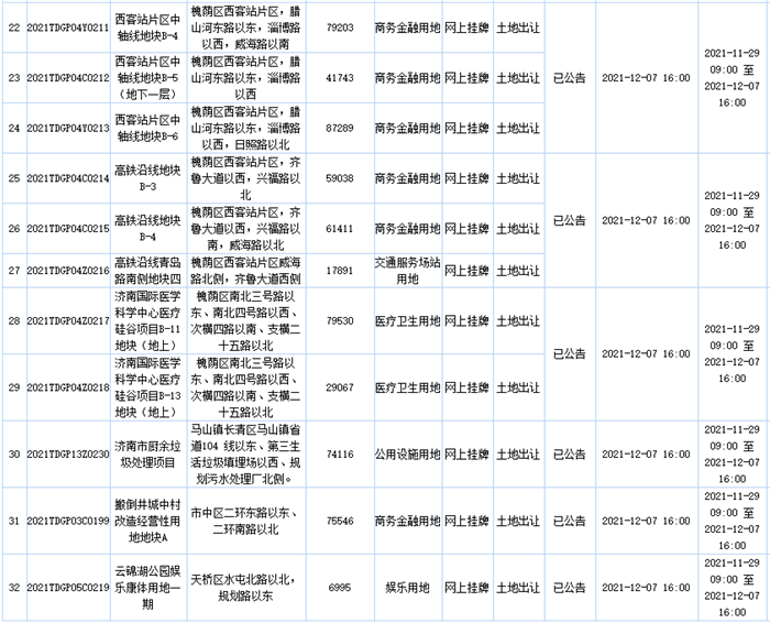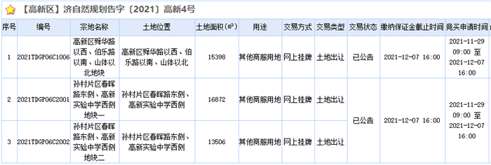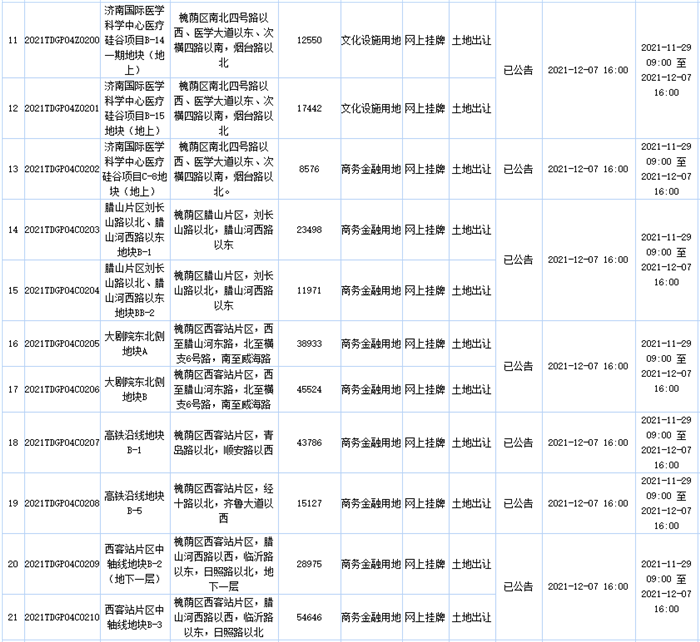 11月9日,济南市自然资源和规划局、济南公共资源交易中心发布国有建设用地使用权挂牌出让公告,出让35宗商业、文化、医疗、娱乐等用地,出让总面积1653亩,涉及槐荫、历城、高新、市中、天桥、长清。