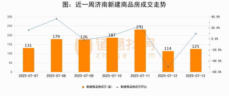 根据济南市住房和城乡建设局数据显示,2025年07月13日济南新建商品房成交125套,较昨日增加11套,环比上涨9.7%