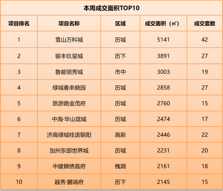 7月4日-7月10日,济南商品住宅签约面积TOP10,雪山万科城、银丰玖玺城分别位于榜单的排名前列、第二名。