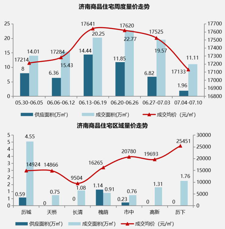 7月4日-7月10日,济南商品住宅市场新增供应1.96万㎡;成交面积11.11万㎡,环比下降43.23%,成交均价17133元/㎡,环比下降2.24%;本周济南商品住宅主力成交项目为雪山万科城、银丰玖玺城等,历城区为主力成交区域。