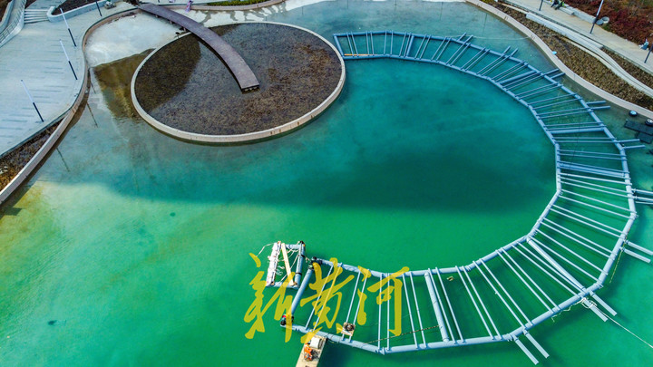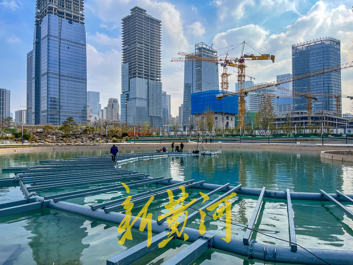 11月28日,在济南新泺大街与茂岭二号路交叉口东南侧,中央商务区少有人工景观湖荷叶湖重新蓄水完成,池水清澈见底,呈现出碧绿的颜色。施工人员在池内开始安装浮管和钢架结构,拼接成圆形后与池中的圆岛相连,然后在钢架结构上安装喷泉和照明系统,最后与池底的正方形水泥墩相连沉入水中。施工全部完成后,荷叶湖将呈现音乐喷泉景观,成为中央商务区绸带公园的一处亮点。