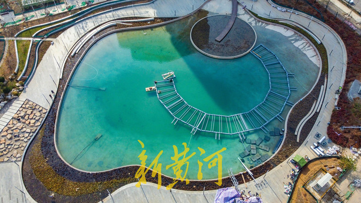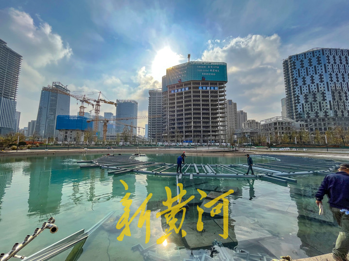 11月28日,在济南新泺大街与茂岭二号路交叉口东南侧,中央商务区少有人工景观湖荷叶湖重新蓄水完成,池水清澈见底,呈现出碧绿的颜色。施工人员在池内开始安装浮管和钢架结构,拼接成圆形后与池中的圆岛相连,然后在钢架结构上安装喷泉和照明系统,最后与池底的正方形水泥墩相连沉入水中。施工全部完成后,荷叶湖将呈现