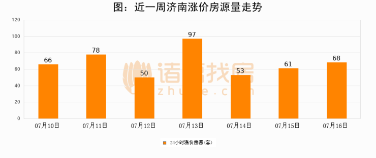 根据诸葛找房数据显示,济南24小时涨价房源量为68套,较07月15日增加7套,环比上涨11.5%。与此同时,涨价房源占比小幅扩大,业主信心有所提升。
