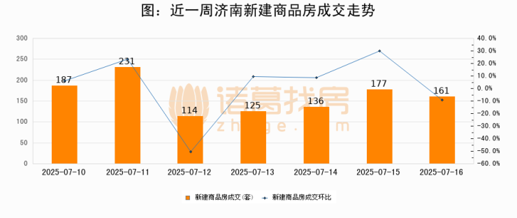 根据济南市住房和城乡建设局数据显示,2025年07月16日济南新建商品房成交161套,较昨日减少16套,环比下降9%