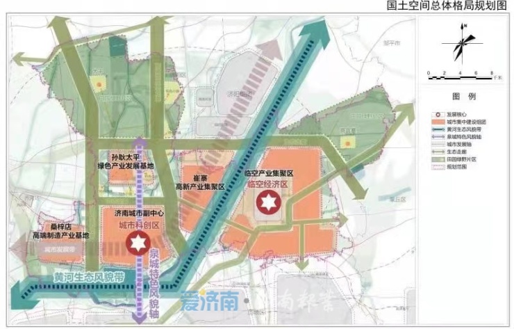 《实施方案》明确了起步区“一纵一横两核五组团”的空间布局。其中,“一纵”是指起步区与大明湖、趵突泉等济南历史标志节点串联起来,形成泉城特色风貌轴;“一横”是指依托水系、林地等自然生态资源,形成黄河生态风貌带;“两核”是指建设城市科创区和临空经济区,带动起步区加快开发建设。“五组团”是指建设济南城市副中心、崔寨高新产业集聚区、桑梓店高端制造产业基地、孙耿太平绿色发展基地、临空产业集聚区。