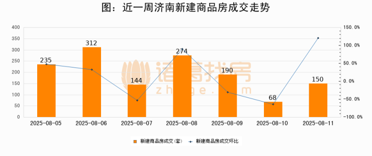 根据济南市住房和城乡建设局数据显示,2025年08月11日济南新建商品房成交150套,较昨日增加82套,环比上涨120.6%
