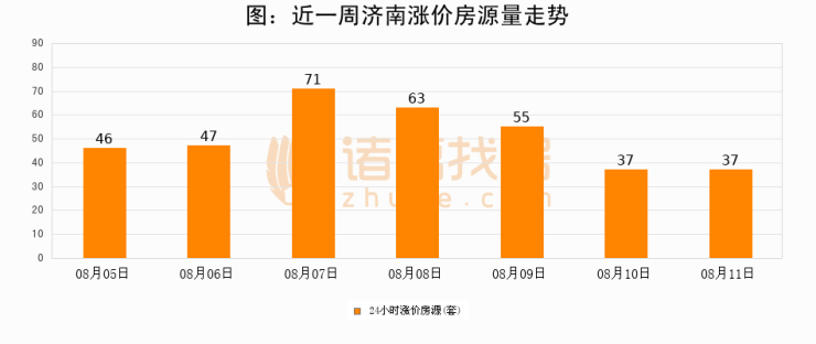 根据诸葛找房数据显示,济南24小时涨价房源量为37套,较08月10日持平。