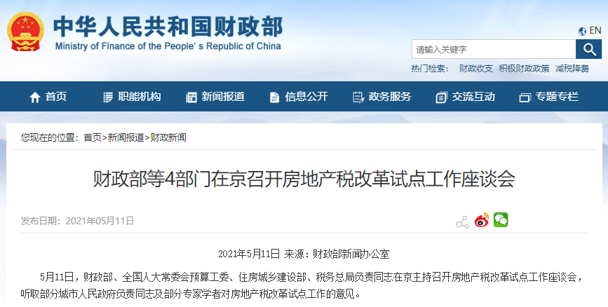 5月11日,财政部官网发布消息,四部门在京主持召开房地产税改革试点工作座谈会,会议重点听取部分城市人民政府负责同志及部分专家学者对房地产税改革试点工作的意见。