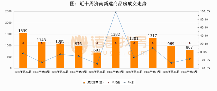 进入2025年第36周(09月01日-09月07日),济南新建商品房成交807套,较上周减少162套,环比下降16.7%。从近十周成交来看,周均成交套数为1111套,本周成交807套,低于近十周平均成交量27.4%。