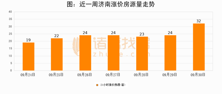 根据诸葛找房数据显示,济南24小时涨价房源量为32套,较09月29日增加8套,环比上涨33.3%。与此同时,涨价房源占比小幅扩大,业主信心有所提升。