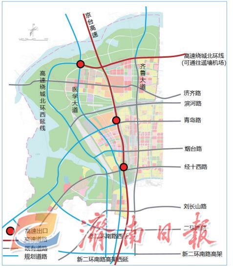 规划用地北侧新增高速出入口,包括2条高速公路,京台高速公路和绕城高速北环线,3个高速出入口,保留现状济南西出入口、槐荫枢纽立交西延增设出入口、增设青岛路高速出入口,分别为济南西出入口、医学中心出入口、青岛路出入口。