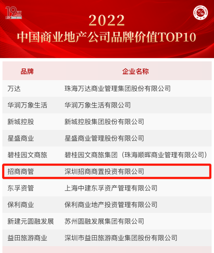 9月15日,北京中指信息技术研究院中国房地产TOP10研究组发布的《2022中国房地产品牌价值研究报告》中,招商商管凭借优秀的商业运营成绩以及在品牌认知度/美誉度/成长速度等品牌多价值维度的出色表现,成功获评“2022年中国商业地产公司品牌价值TOP10”,取得榜上第6位的殊荣。