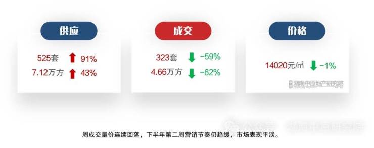 湖南中原地产研究院的数据显示,上周长沙市内五区商品住宅供应7.12万平方米,环比增长43%,但仍低于今年周均水平;成交量连续回落,网签成交4.66万平方米,环比减少62%,成交量连续两周回落,处于今年周度成交量低位水平,市场暂时表现平淡。