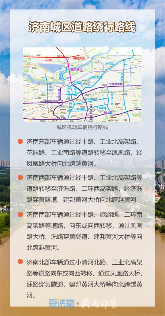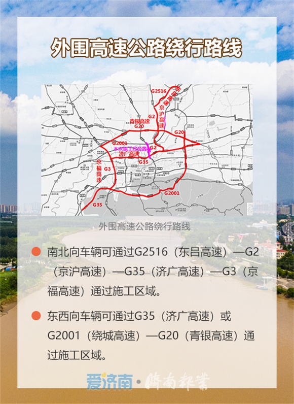 济南G104京岚线济南黄河公路大桥扩建工程正在实施跨黄河大桥建设,昨晚12点起,启动零点立交桥和二环东高架北端改造工程,施工工期为2022年3月31日至2024年12月31日。施工期间外围高速及市内交通绕行方式如下:
