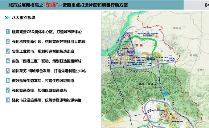 2003年,济南提出东拓战略。此后,发展势头沿着城市大动脉经十路,一路向东高歌挺进,济南东部板块迅速崛起。十几年后,济南市提出进一步形成“东强、西兴、南美、北起、中优”城市发展新格局。东强战略中首要任务便是建设完善CBD奥体中心区,打造城市新中心。