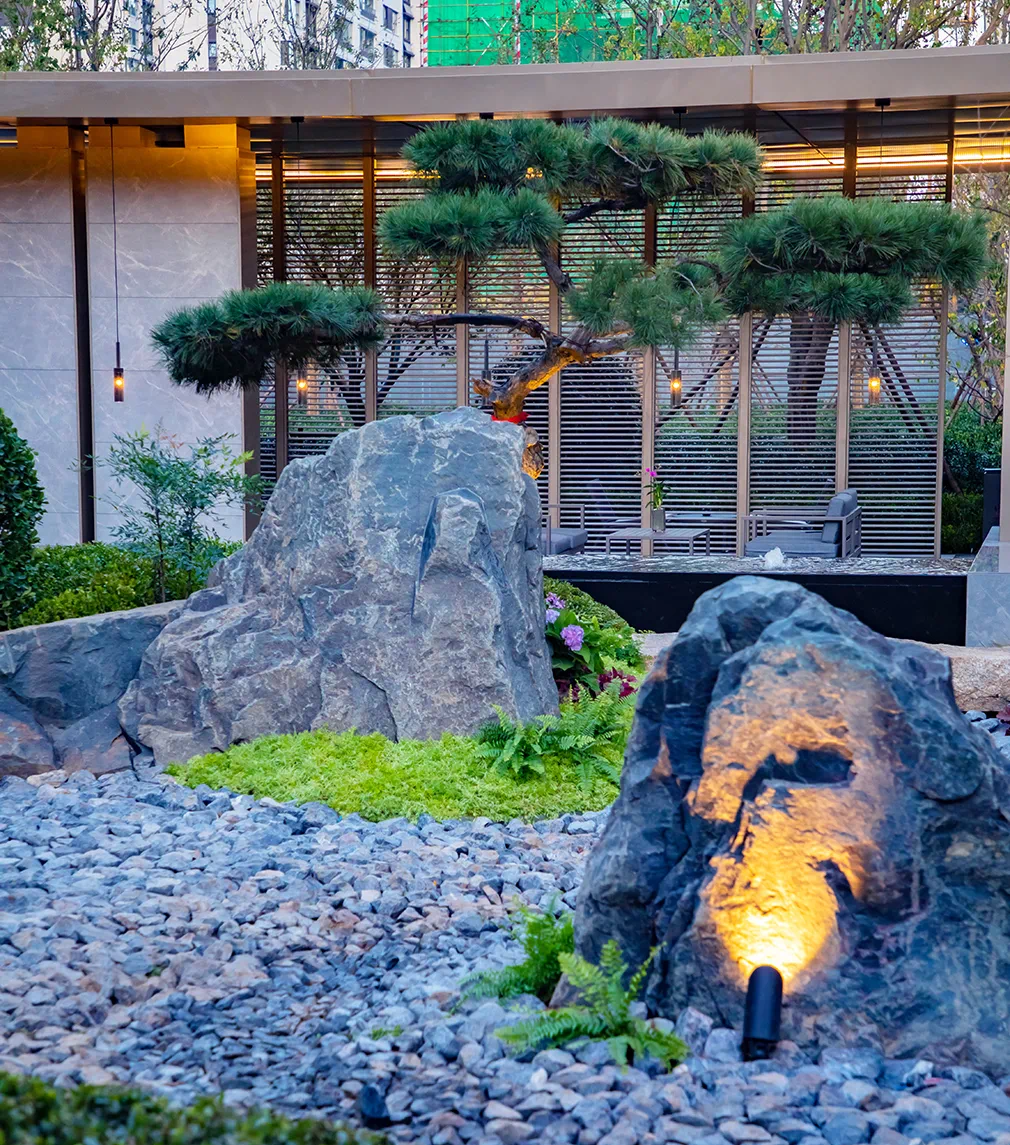 “淡磨明镜照檐楹”,宛若出世入世的顽石叠泉静伏于通道空间,延续的横向线条,是秩序的统一、又是归家的礼仪、是指引、是承载,予内心以平静,回味绵长;园区里的造型松,让空间界定的视线得以游离,仿佛低语、仿佛迎客、仿佛触摸未来的美好生活。